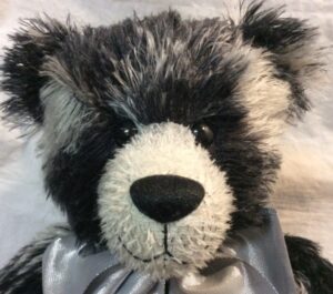 Mr Black is a 46 cm / 18", fully jointed teddy bear. He has been sewn from a luxuriously soft and dense, thread-textured shaggy-pile mohair in black and silver-grey and tactile, cocoa suede paws with his right sole featuring a facsimile of the Robin Rive logo and her signature, whilst glossy black eyes with a hand stitched black nose and mouth upon his contrasting and carefully trimmed, white muzzle adds character. To finish, he wears a silver satin waistcoat and matching ribbon bow.