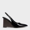 These slingback wedges in black feature glossy uppers, pointed toes. translucent heels and adjustable straps. Wear them with trousers or skirts for a classic look that balances timeless elegance with everyday practicality.