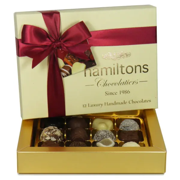 Indulge in 12 luxury handmade chocolates presented in a ivory box, featuring rich truffles, fruity creams, and pralines in milk, dark, and white varieties.