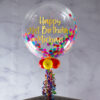 Decorate a party venue or wish someone a happy 13th birthday with this personalised bubble balloon, filled with confetti in your chosen colour scheme. You can also add your own text on the outside, with a special message or the person’s name. To finish the look we add 4 small balloons to the base of the balloon and add colour co-ordinated ribbons and weight.