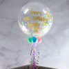 Decorate a party venue or wish someone a happy 13th birthday with this personalised bubble balloon, filled with confetti in your chosen colour scheme. You can also add your own text on the outside, with a special message or the person’s name. To finish the look we add 4 small balloons to the base of the balloon and add colour co-ordinated ribbons and weight.