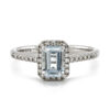 A gorgeous right hand cocktail dress ring in all 18ct white gold. The slim 18ct white gold band is set with diamonds on the shoulders in a claw setting. The ring features a 1.84cts octagonal aquamarine gemstone in white gold claws, which is surrounded by round bright white diamonds in a claw setting. The diamonds have a total carat weight of .48cts