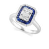 18ct White Gold Fancy Coloured Sapphire and Diamond Cluster Edged Band A rainbow of fancy coloured round rainbow sapphire gemstones run through the centre of this dress band. Each sapphire gemstone is hugged around the edges with a halo cluster of round brilliant cut diamonds in a micro claw white gold setting. The ring is set on a plain polished band. The sapphires total .84cts and the diamonds total .16cts