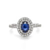 An outstanding all 18ct white gold gemstone ring. This ring features a superb deep blue oval sapphire to the centre which is 1.50cts. The sapphire is surrounded by 12 round brilliant cut diamonds which are each set in an four claw white gold setting. The bright diamonds have a total carat weight of .82cts