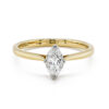 A beautiful 18ct yellow and white gold engagement ring with a twist. The yellow gold band is set with 7 diamonds on each side on a twist, the side diamonds total .10cts. The round brilliant cut diamond in the centre is a stunning D/VS2 certificated .30cts diamond set in a white gold claw setting.