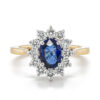 A lovely rich 18ct yellow gold band of this ring leads to a white gold setting. Sitting in the centre is an oval .55cts ruby in a claw setting. To each side of the ruby is a round brilliant cut diamond in a four claw setting. The ruby is .55cts and the diamonds have a total carat weight of .20cts