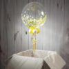 Make your child’s first birthday one to remember with a vibrant and individualised, readily-inflated decoration. These lavish and unique balloons are filled with multicoloured shades of confetti to make sure every celebration goes off with a bang! Our bespoke balloons in a box can be personalised with your own special message in either glitter handwriting or text cut from vinyl and adhered to the surface of the balloon. We inflate a 20″ spherical clear plastic balloon and then insert confetti; to finish we add 4 small balloons to the base of the balloon and add colour co-ordinated ribbons and weight.