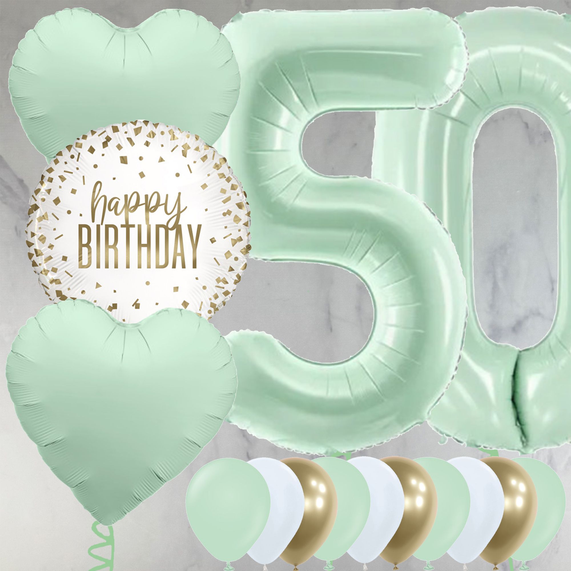Celebrate a 50th birthday in style with our mint green foil numbers balloon package, arriving inflated in the post – a great gift and decoration for the big event. The 50th balloon package includes two 26″ mint green foil balloon numbers filled with helium, plus our special foil balloon bunch including a ‘Happy Birthday’ design. We add in 10 free scatter balloons to match the colour scheme.