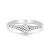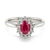9ct White Gold Ruby and Diamond Three Stone with Diamond Shoulders A beautiful 9ct white gold ring which features tapered diamond set shoulders, which lead up to an oval ruby set in four white gold claws, with a round diamond each side in an illusion setting. The diamonds total .22cts