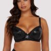 Strap into next level lingerie and the confident florals of the ‘Aisha Black Optical Embroidery Ring Bra’. Featuring full, underwire cups and longline bridge cut from barely there nude mesh overlaid with bold black geometric botanic embroidery, this is a seductive statement piece that will take you from the bedroom to the bar styled underneath a sharp blazer. Gold metal o-rings connect three adjustable thick satin elastic bands and shoulder straps, which lead to a caged back with hook and eye fastener. For the full luxury look, pair with the matching Aisha Thong.