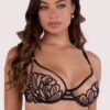 Strap into next level lingerie and the confident florals of the ‘Aisha Black Optical Embroidery Ring Thong’. Cut from barely there nude mesh overlaid with bold black geometric botanic embroidery, this is seductive black thong guaranteed to make a statement. Gold metal o-rings connect two thick adjustable satin elastic straps, which cross at the back and lead to the black mesh thong.For the full luxury look, pair with the matching Aisha Bra.