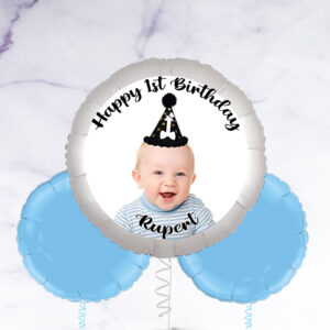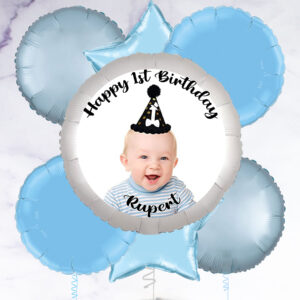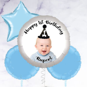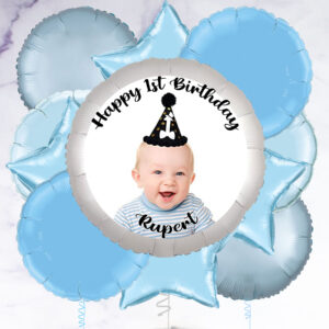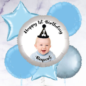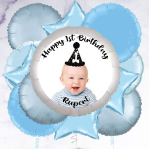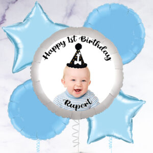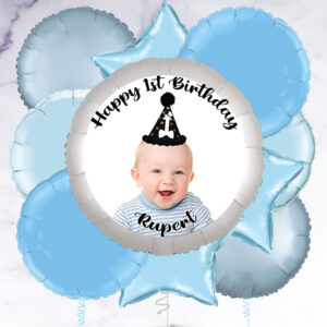 Our personalised photo balloon is the perfect gift for a special occasion such as a little boy’s birthday, gender reveal or for a newborn, with the option to add a selection of foil balloons to make a fantastic bunch. Arriving inflated, you can add a photo of your choice to the balloon, as well as a personalised message. Photo balloon is 23″ in diameter, Foil balloons are 18″ – 20″ in diameter, Balloons arrived inflated with a weight, Float time: Approx 10 – 14 days, Note: If you order 4 or more balloons, your order may arrive in multiple boxes, How It Works Upload your image. Choose an image that’s as big as possible – this will allow you to choose the right part of your image to feature on the balloon., Use your mouse (computer) or finger (mobile/tablet) to move the balloon over your image in the preview above. Use the arrows to zoom in and out until you’re happy with your selection., Add your text – we can add one line of text at the top and one line of text at the bottom, or you can choose to have no text at all., Use the ‘Click here to see a preview’ button to see what your finished balloon will look like., On the next stage you can choose to add between 1 – 11 foil balloons to create a bunch.,