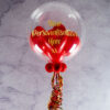 Celebrate your baby’s first Christmas with this glamorous personalised bubble balloon decoration – use our default ‘Baby’s First Christmas’ print in gold lettering, or create your own message! A truly special way to remember it by, it’s a lovely gift or decoration and, once deflated, can be kept in a memory box for years to come. To create this unique balloon in a box, we fill the 20″ clear outer balloon with white feathers, and finish it with colour co-ordinated smaller balloons, ribbons and a weight.