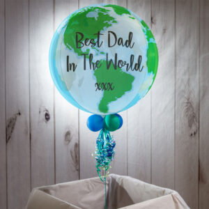 Let Dad know how much he’s appreciated on Father’s Day with this fantastic spherical globe balloon gift from Party On Balloons! Comes personalised with the special wording of your choice and customisation options for the font and colour. We finish this globe bubble with a collar of matching balloons, ribbons and a weight. Our 16″ foil balloon will float from the box when delivered, and will typically last 7 – 10 days.