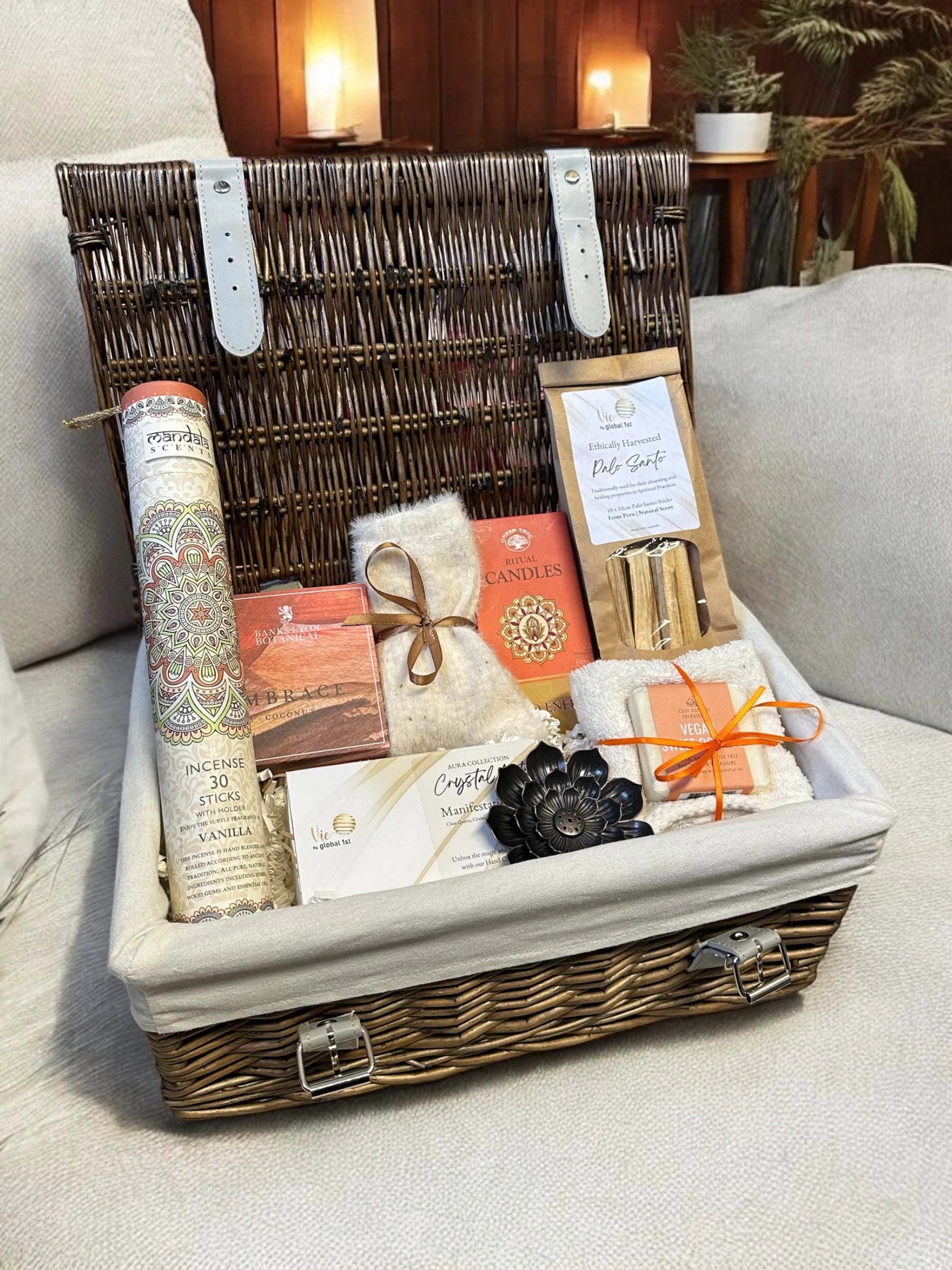 Boho relaxation gift includes incenses, Vanilla sticks, crystal kit, ritual candles, Palo Santo. Perfect for soothing chakra and enhancing tranquility.