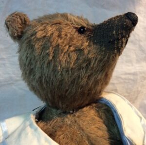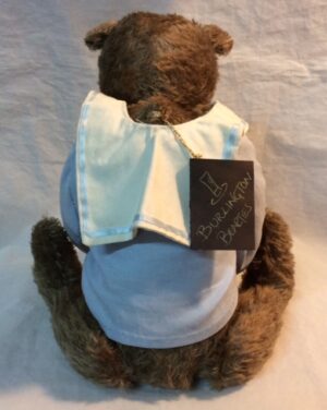 Reuben Lockett is a fully jointed, character teddy bear with a charming wobble head. He has been sewn from a luxurious and dense, brown mohair with matching hued, warm wool felt paws, plus glossy glass black eyes, twinkling above his hand stitched, waxed nose and mouth, that rest upon his expertly trimmed muzzle and lovingly stuffed with granulated mineral for that extra weight and addictive tactile feel, whilst hand applied shading has been carefully applied to his face and paws, bringing personality, charm and appeal. In finishing, he wears a tailored sky blue jacket with a white sailors collar featuring a satin ribbon trim.