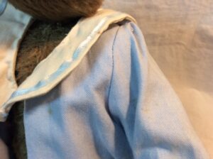 Although very minimal, there are some slight brown markings upon his blue jacket. Front left, just below collar and the top of the left arm. See all provided images. This does not deter from Reuben's enchantment and he has been priced accordingly.