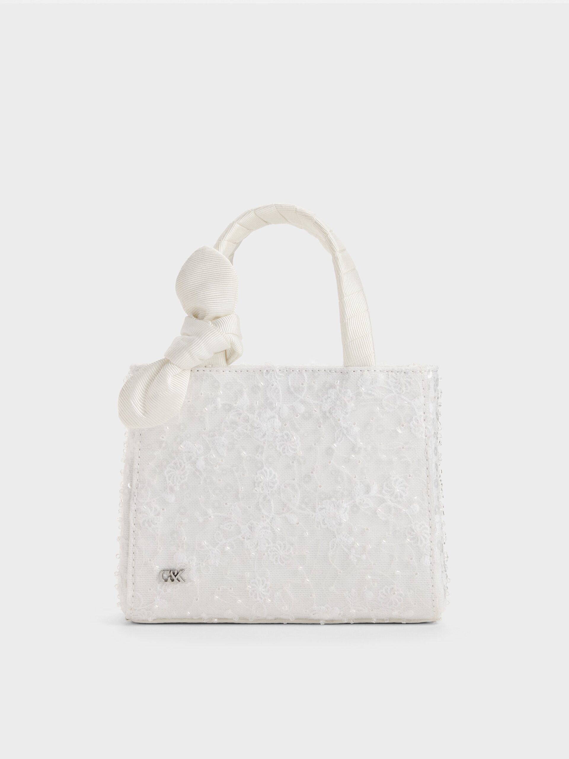This Albany mini bag in white is made with silk and embroidered mesh. It features a boxy construction, beaded embellishments, double handles, a distinctive bow detail, a magnetic closure and a detachable chain strap. Let it complement bold special-occasion outfits with its outstanding design.