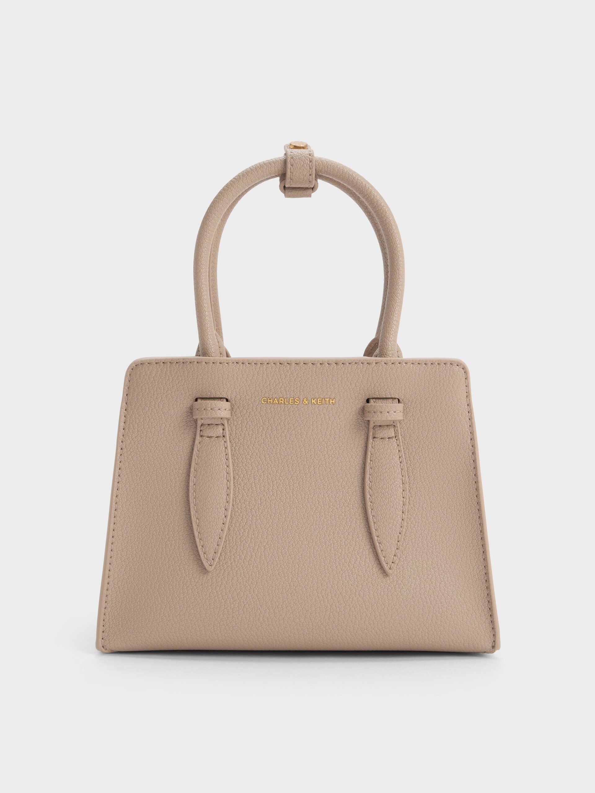 This Allyn tote bag in taupe features a structured trapeze silhouette, double handles and a sleek, minimalist design. Style it with neutral-toned tailored outfits for a polished and sophisticated workwear look.