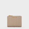Show off your sense of style in a subtle and understated way with the Apolline wallet in black. Affixed with gold-toned hardware for a hint of shine and an irresistible textured finish remininscent of cable knit sweaters, this wallet is the perfect seasonal update for your accessory rotation. Besides a top-zip compartment, this wallet is secured by a snap-button closure that opens up to reveal multiple slots and compartments to keep your valuables optimally organised.