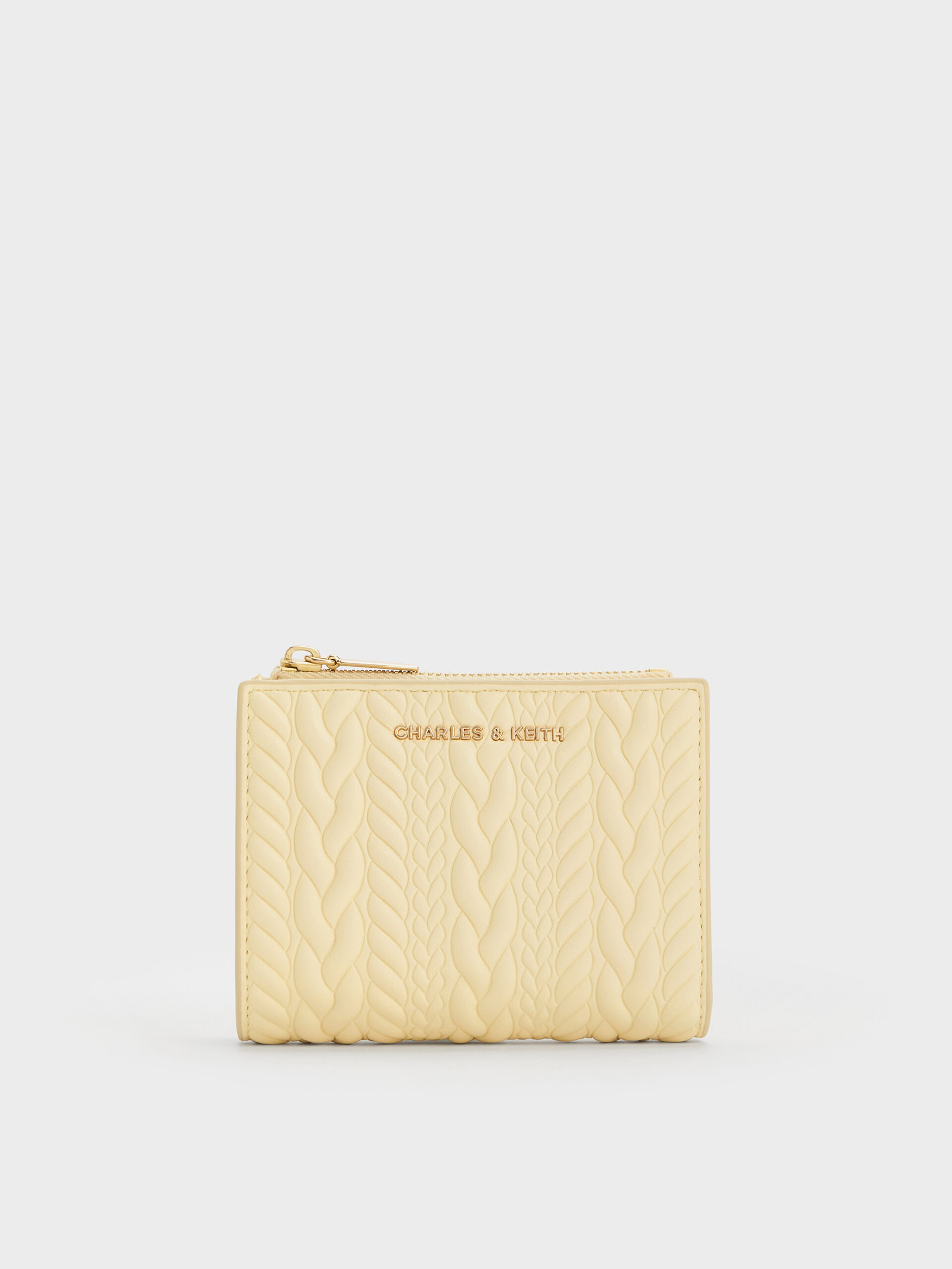 This Apolline wallet in butter yellow features a textured finish embossed with a beautiful weave pattern, a zippered coin compartment, a compact bi-fold design and a snap-button closure. It will fit comfortably in the palm of your hand, making it great for lunch breaks and errand runs.