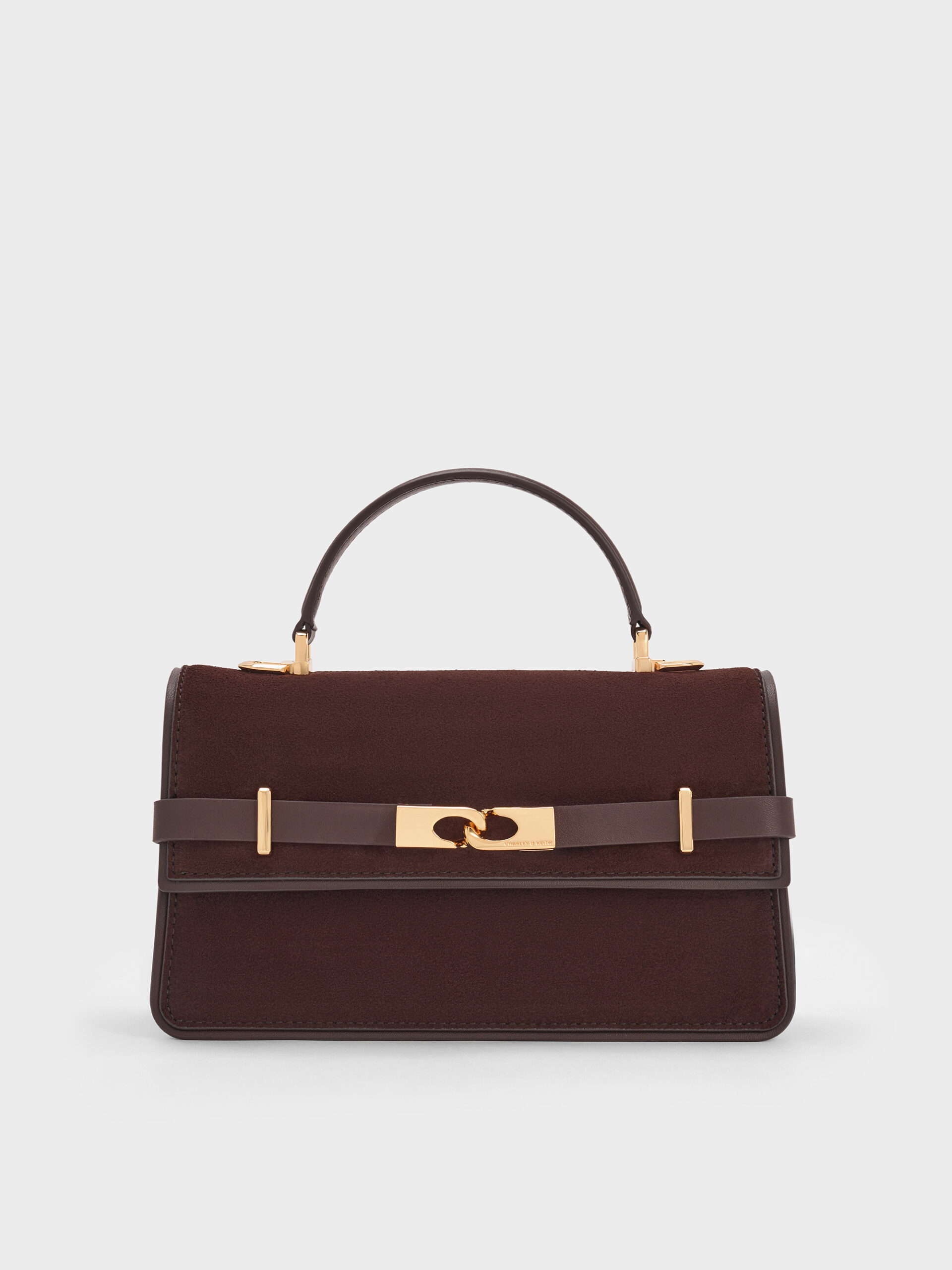 This Arlet top handle bag in espresso brown features boxy construction and a belted strap with a metallic buckle. Carry it with matching earth-toned clothes to create a warm neutral outfit.This product contains recycled material.