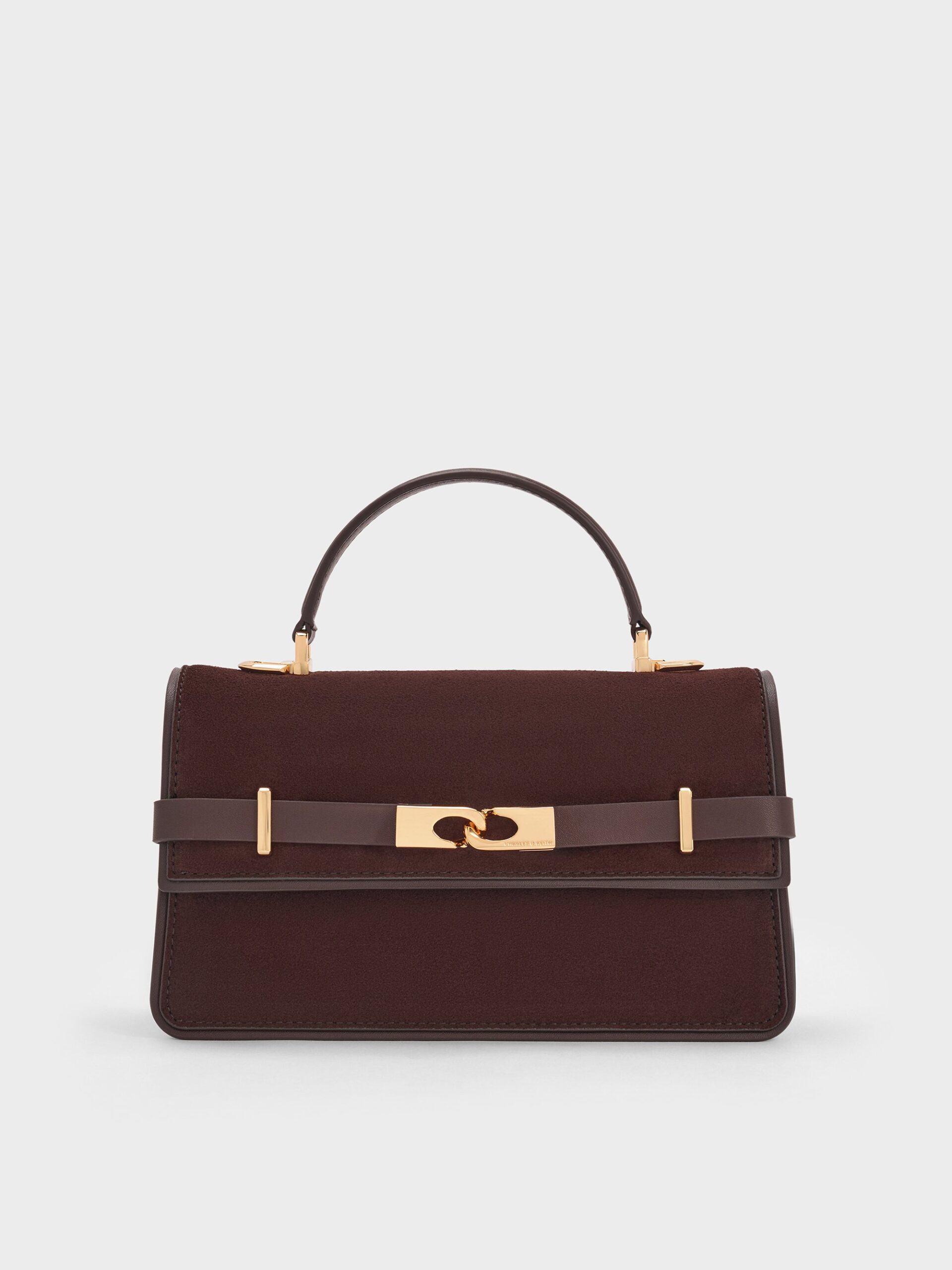 This Arlet top handle bag in espresso brown is made with recycled suede and features boxy construction and a belted strap with a metallic buckle. Carry it with matching earth-toned clothes to create a warm neutral outfit.Recycled suede requires a little extra care. After each use, gently brush the surface in one direction with a soft brush to remove dust and dirt. For stubborn stains, lightly dampen a cloth with a mild cleaning solution and gently rub the fabric until the stain is gone.