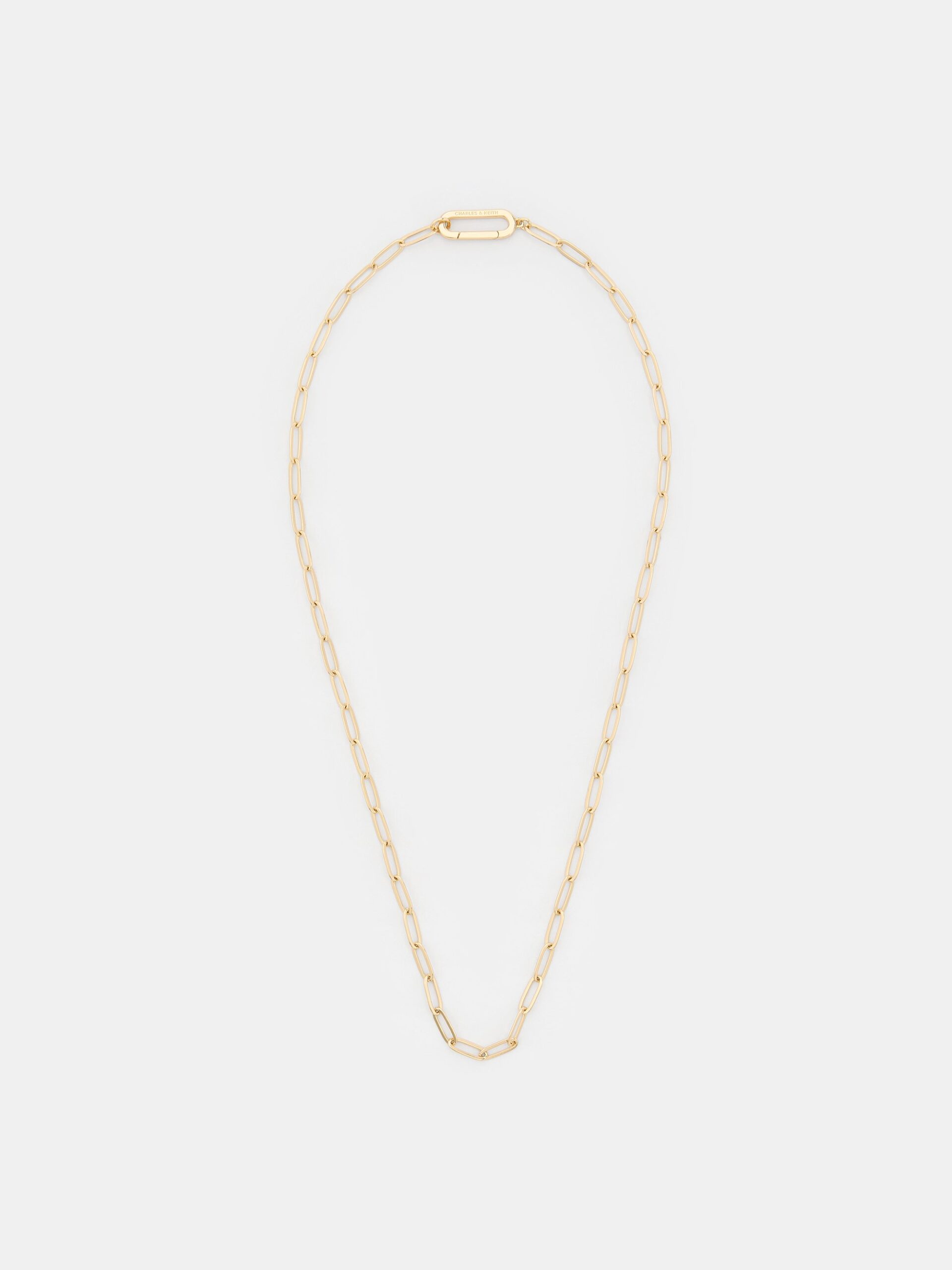 This Arleth necklace in gold features a chain-link design and an oblong pendant at its centre. It will elevate simple blouses and your favourite knitted tops with its simple yet striking aesthetic.
