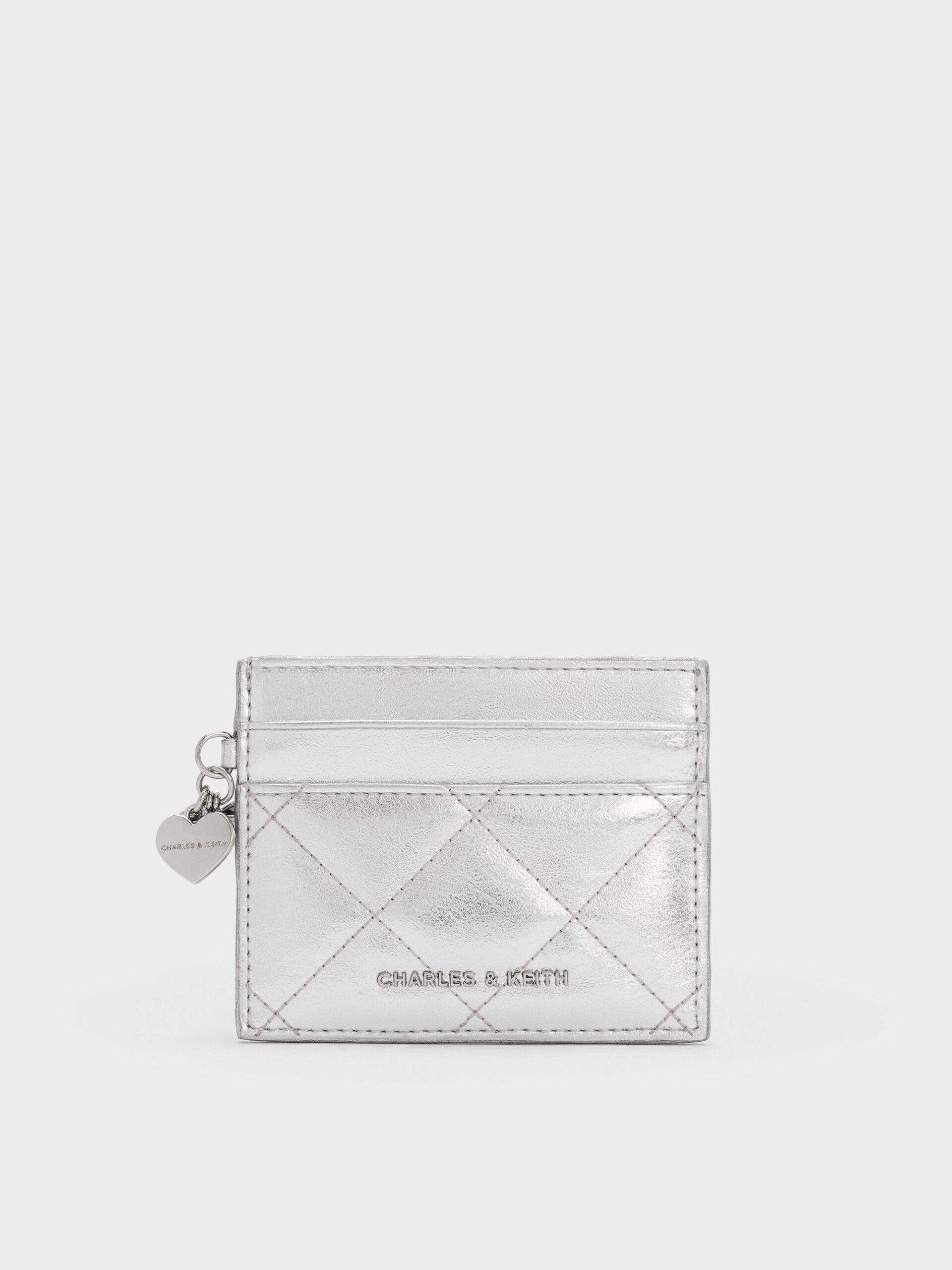 This Arrietty card holder in silver features a quilted finish, shiny heart and bow charms and a compact construction. This practical piece is slim enough to fit into side pockets and small bags.