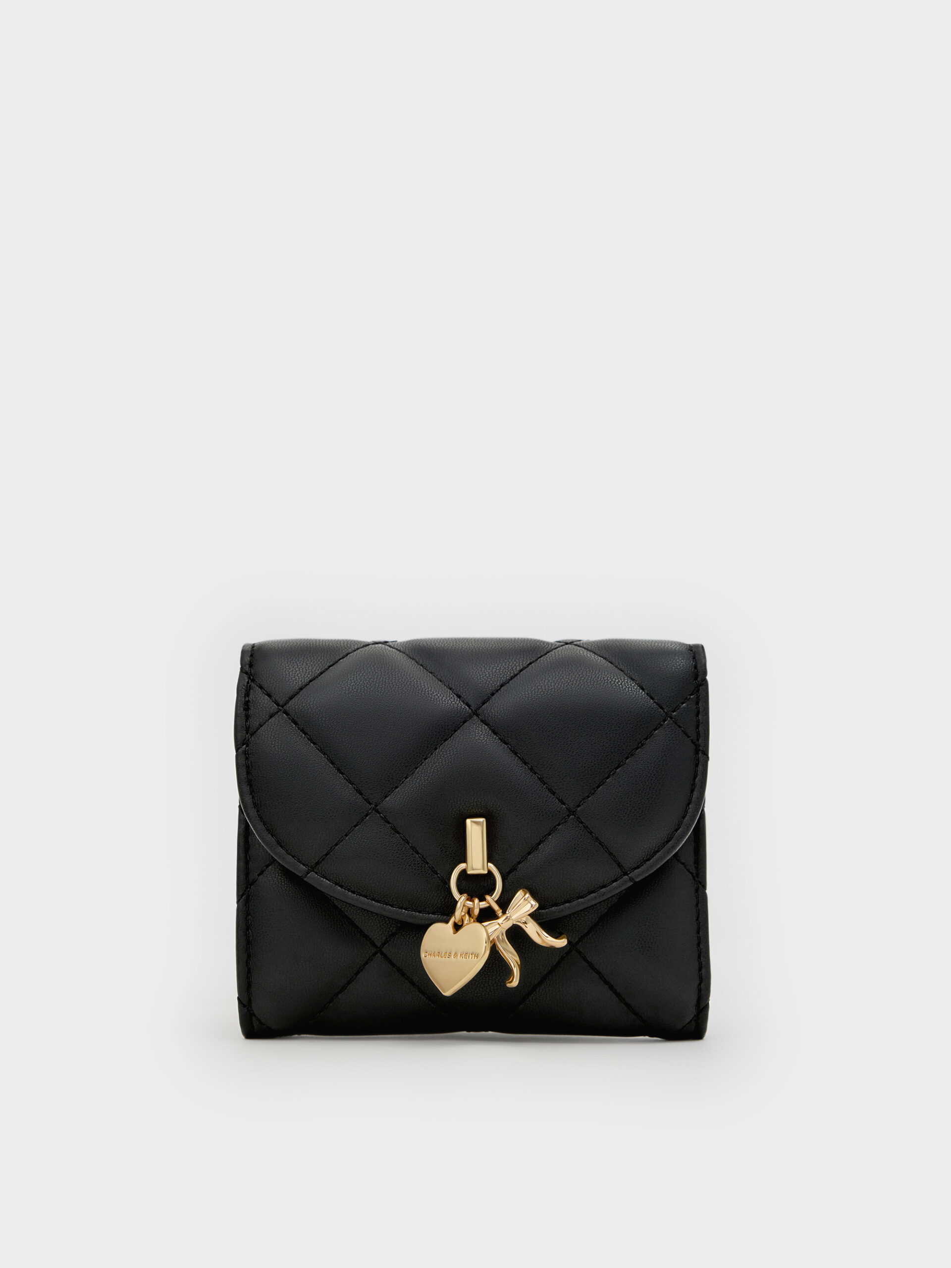 This Arrietty wallet in black features a quilted finish, shiny heart and bow charms, a curved front flap and a magnetic closure. It will brighten up your everyday routine with with its soft structure and pretty details.