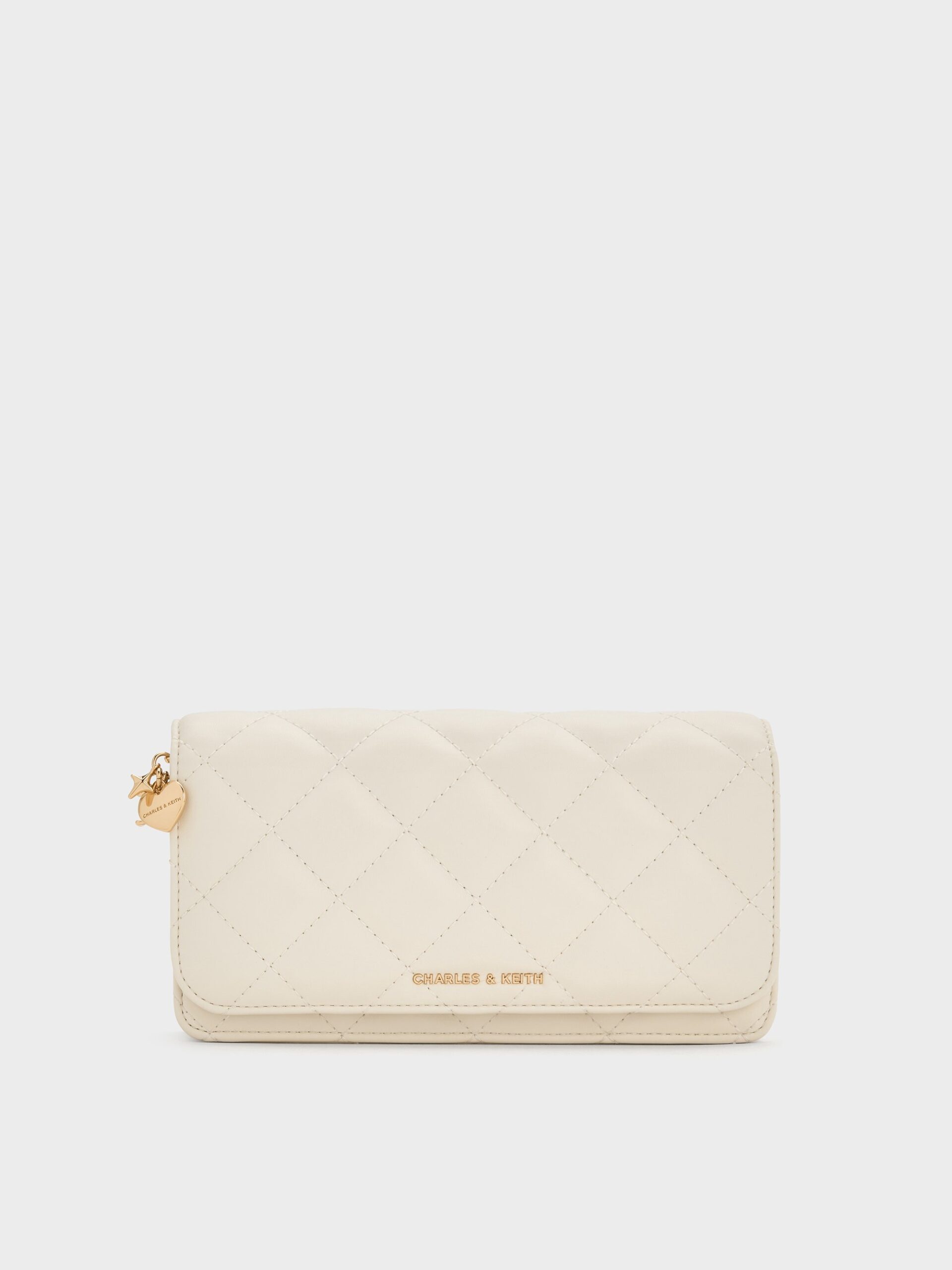 This Arrietty wallet in cream features a quilted finish, shiny heart and bow charms, a detachable chain strap, and a secure magnetic closure. Use it to bring an elegant element to your weekday edits.