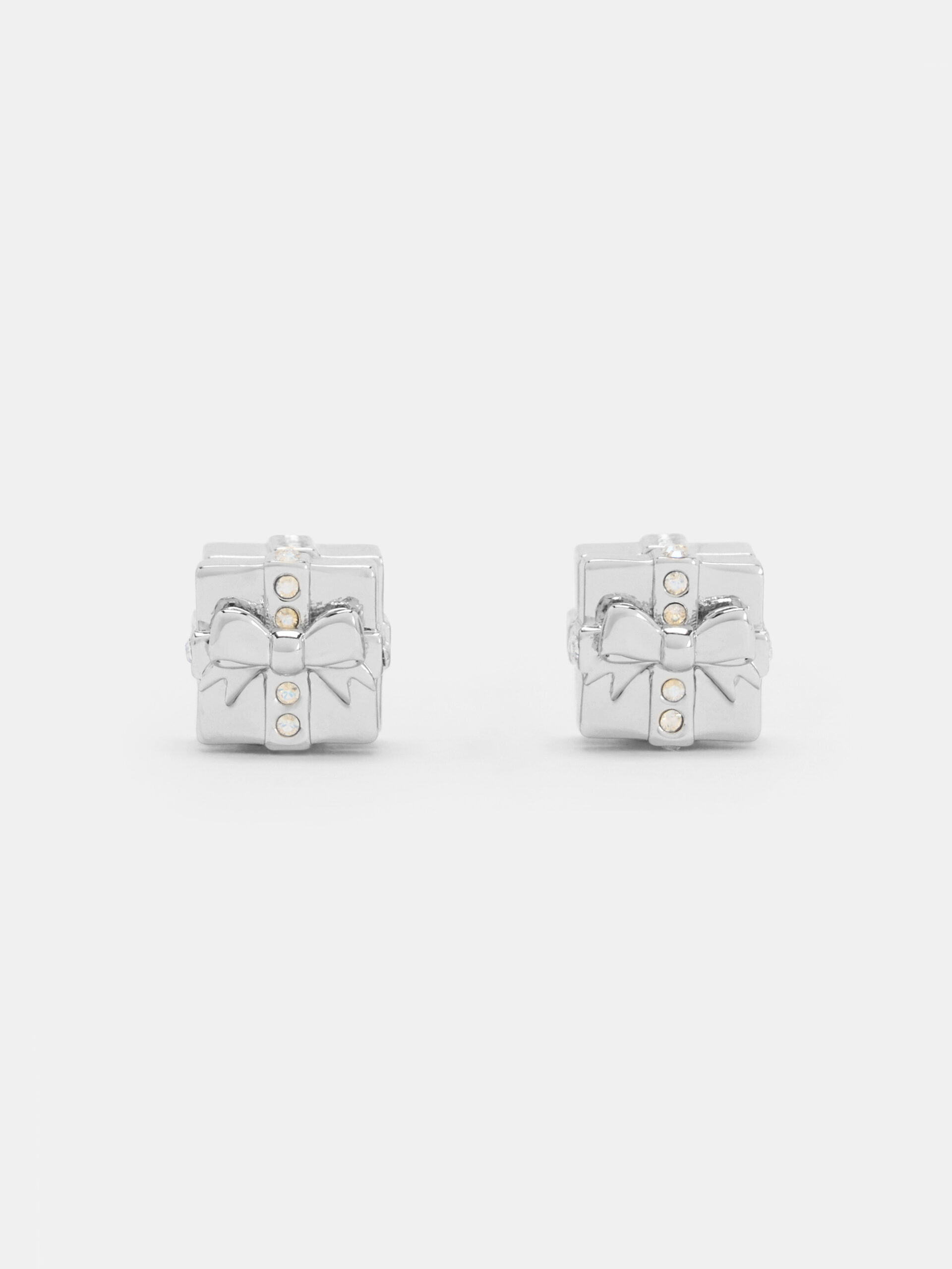 These Athalia stud earrings in silver feature crystal-embellished gift-box motifs and a polished finish. Let them elevate monochromatic ensembles with their cool-tone shine and understated festive charm during the year-end season.