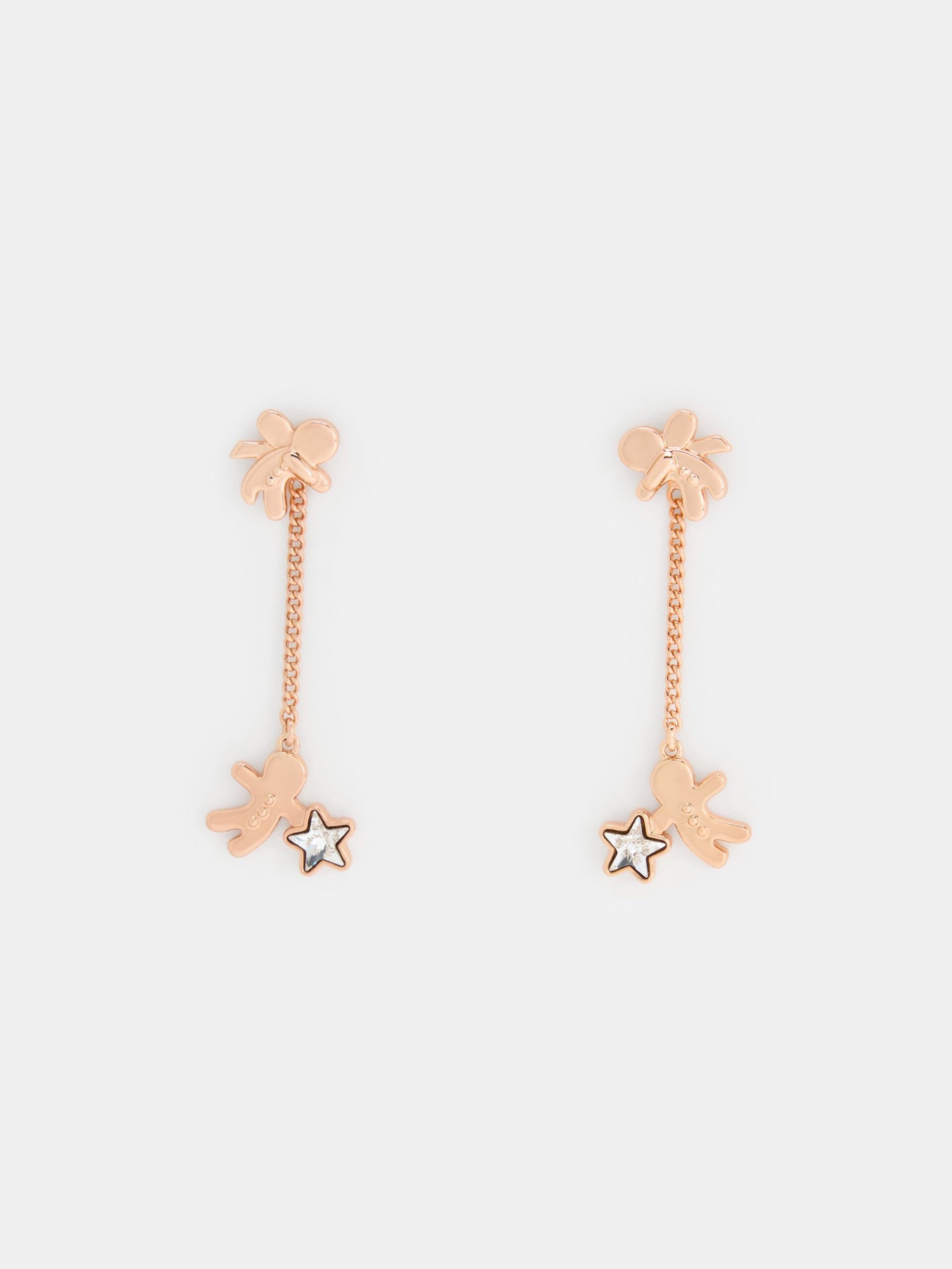 These Athalia earrings in rose gold feature gingerbread-fairy motifs, crystal stars and a chain-drop design. Use them to add playful festive charm to your look while keeping a polished aesthetic.