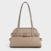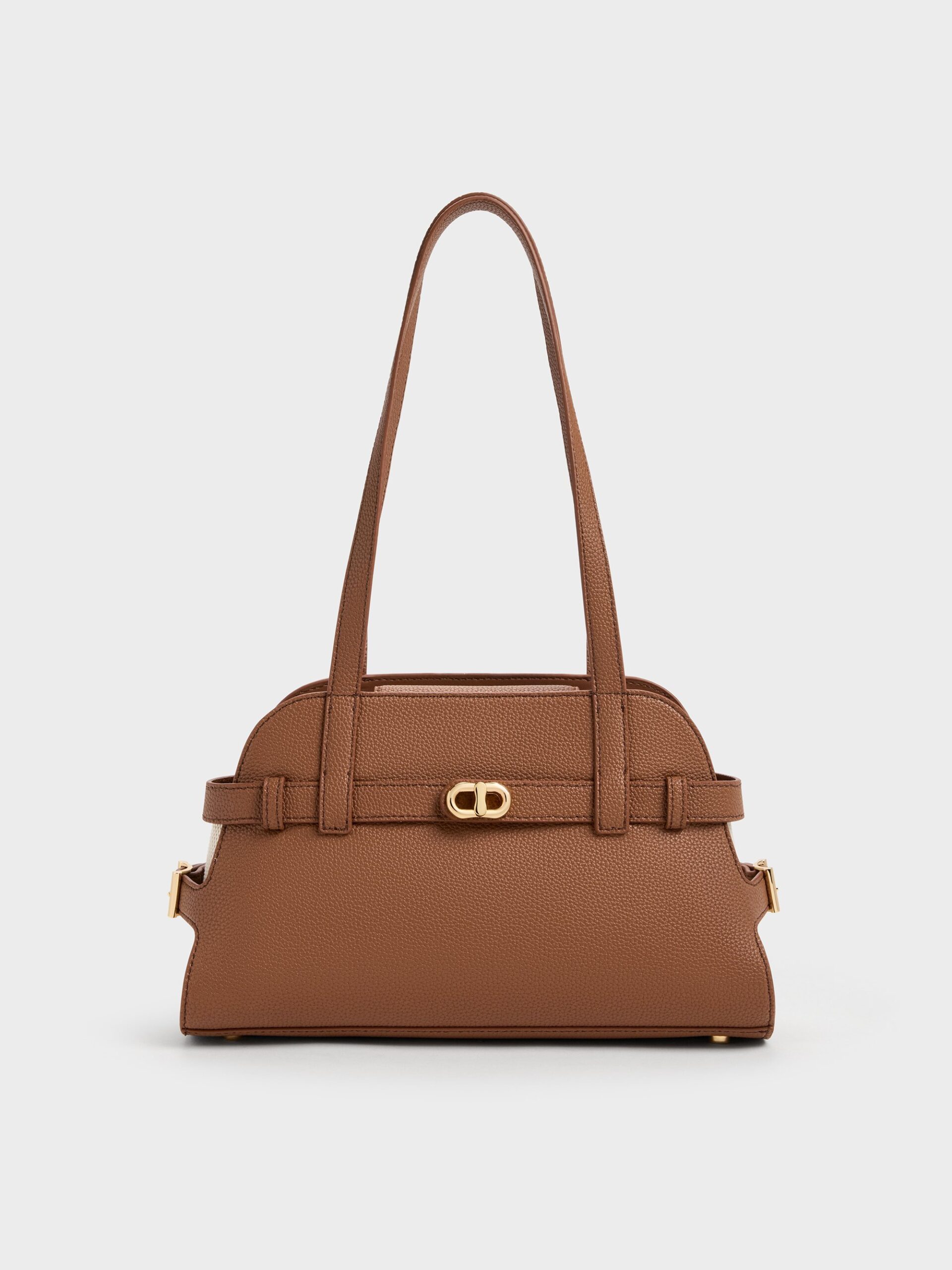 This Aubrielle shoulder bag in chocolate features a trapeze silhouette, buckled straps across its canvas sides, a belted design with a gold-tone buckle and elongated double handles. Style it with your favourite cotton dresses and sandals for a look that feels relaxed but look put together.