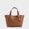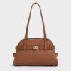 This Aubrielle shoulder bag in taupe features a trapeze silhouette, buckled straps across its canvas sides, a belted design with a gold-tone buckle and elongated double handles. Use it to soften tailored separates with its light-tone neutral hue and minimalist design.