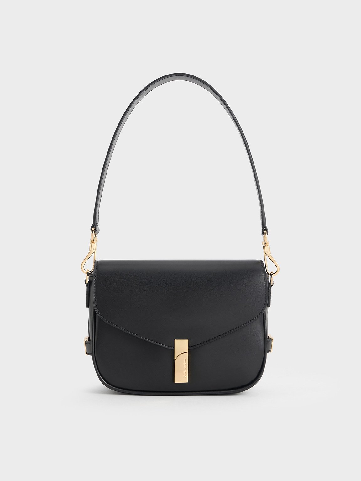 Sleek and sophisticated, this Aurelia saddle bag is a modern classic that will never go out of style. Featuring a timeless silhouette and a versatile black finish, this polished carrier stands out with its distinctive gold-tone hardware. A chic turn-lock closure — taking the form of a narrow vertical bar — is the striking centrepiece of this design. This bag also comes with an adjustable strap that you can clip on easily to transform it into a handy crossbody bag.