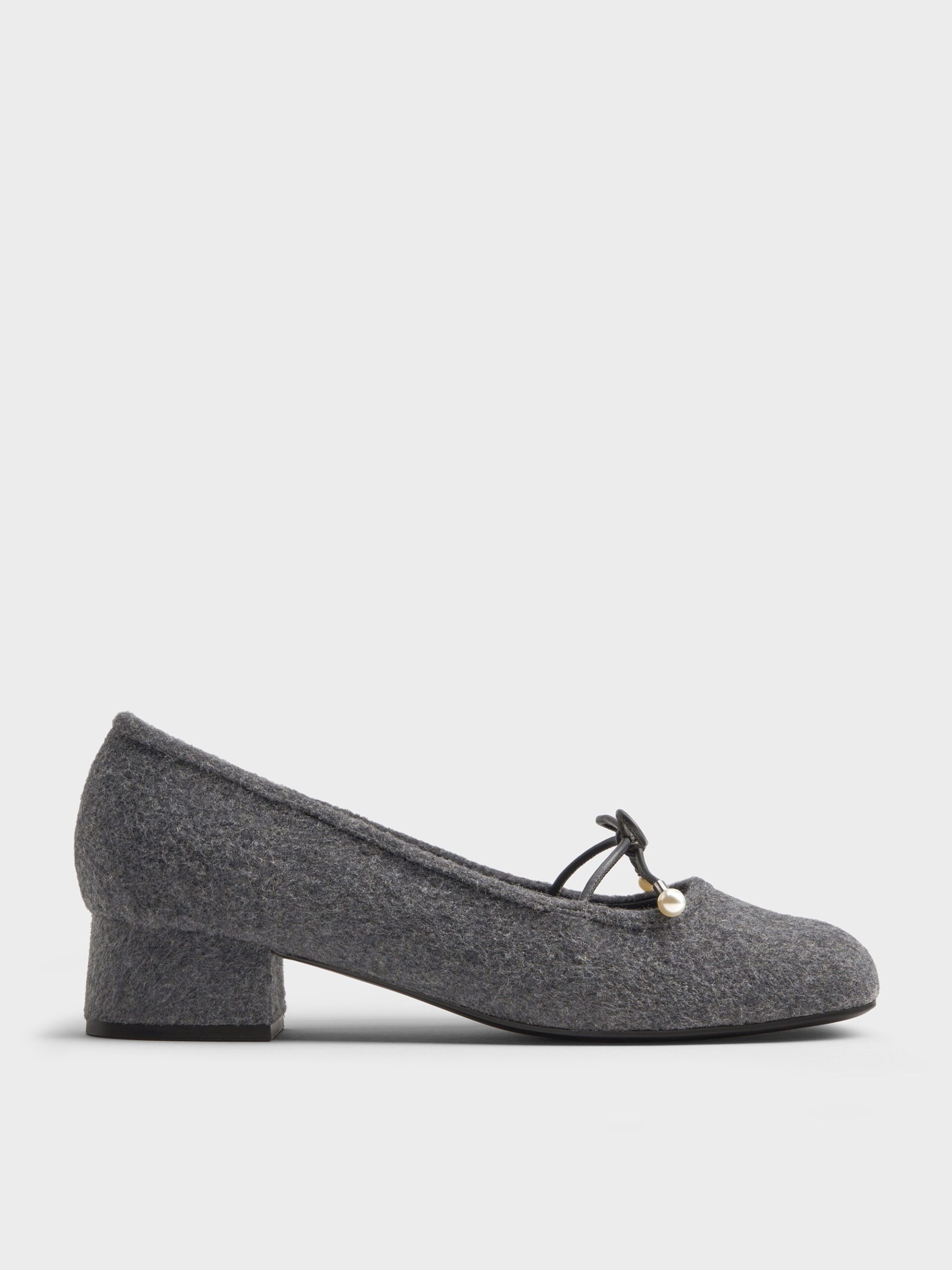 These Barbara ballet pumps in grey are made with felt and feature pearl embellishments, bow details, rounded square toes and block heels. Match them with relaxed tailoring for everyday polish and comfort.