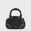 This Bobbie top handle bag in brown is made with recycled suede and features studded details and a curved silhouette. It also comes with a detachable shoulder strap. Let it complement denim jumpsuits for a weekend look that feels edgy and polished at the same time.Recycled suede requires a little extra care. After each use, gently brush the surface in one direction with a soft brush to remove dust and dirt. For stubborn stains, lightly dampen a cloth with a mild cleaning solution and gently rub the fabric until the stain is gone.