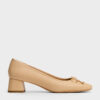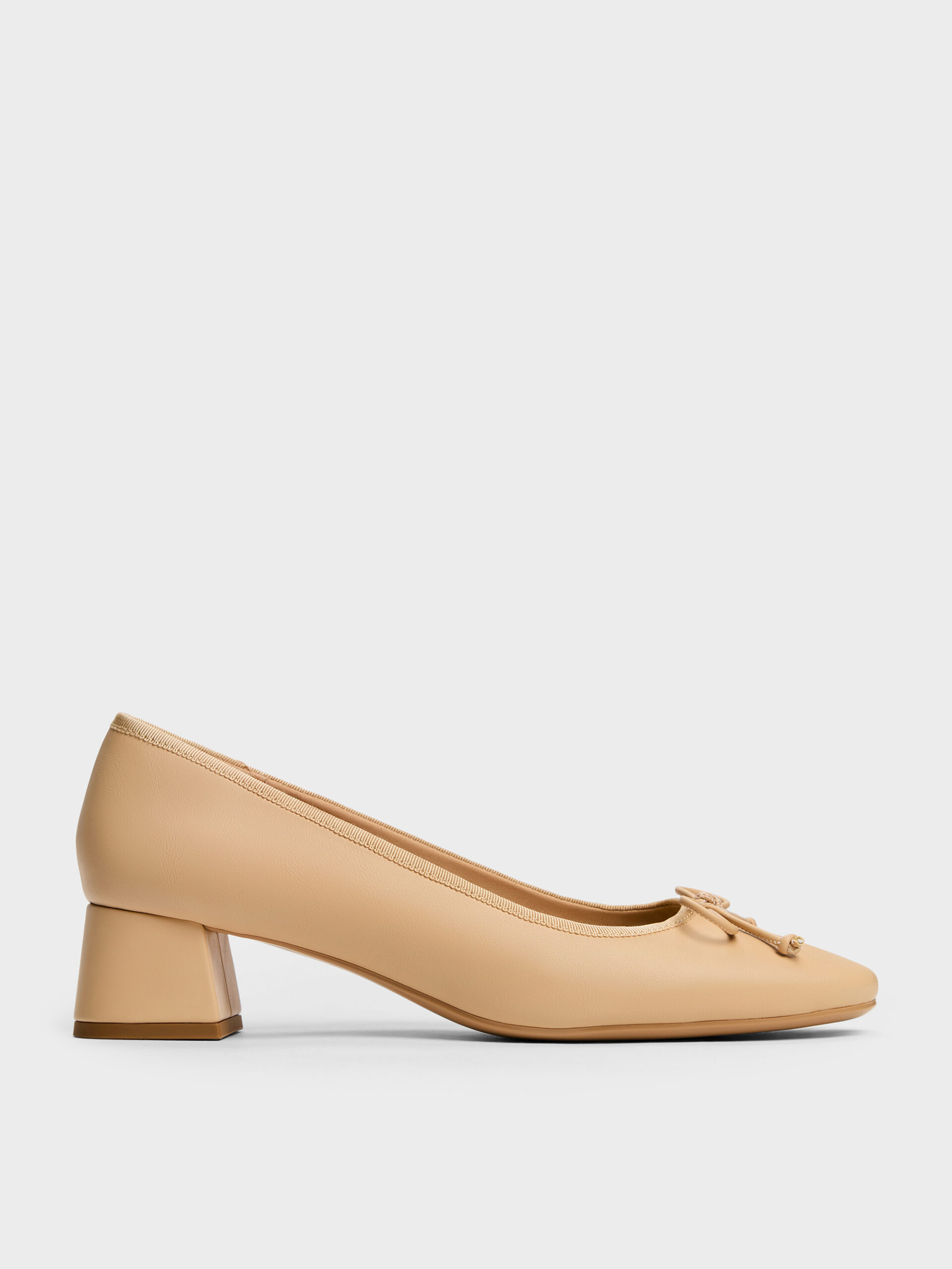 These ballet pumps in sand feature dainty bow details, chunky block heels, and softly rounded almond toes. Use them to complement your work staples with polished femininity and elegant details.