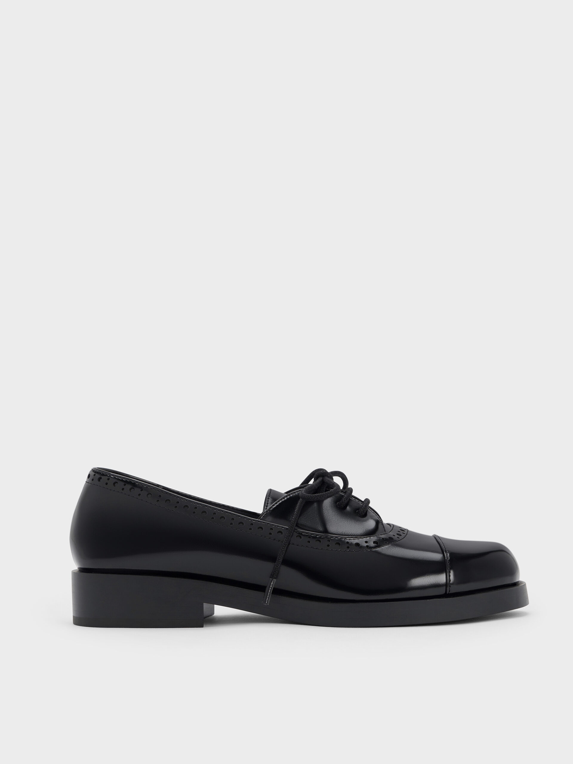 These Derbys in glossy black feature striking brogue detailings and thick sturdy soles. Match them to simple co-ords for a look that balances ease with sophistication, perfect for fluid schedules.