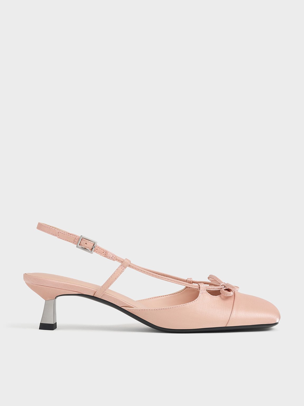 With their delicate light-pink finish and eye-catching bow embellishments, these slingback pumps are perfect for achieving a girly look. Details like the rounded square toes and metallic kitten heels add a modern twist to the classic design, while the adjustable slingback straps offer a personalised fit. Providing a stylish height boost without sacrificing comfort, they can be worn anywhere, with any outfit, for any occasion.