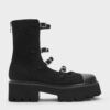 These Celia calf boots in black feature burnished uppers, four buckled straps, chunky soles and back zips. Use them to bring edge and utility to layered cold-season edits.