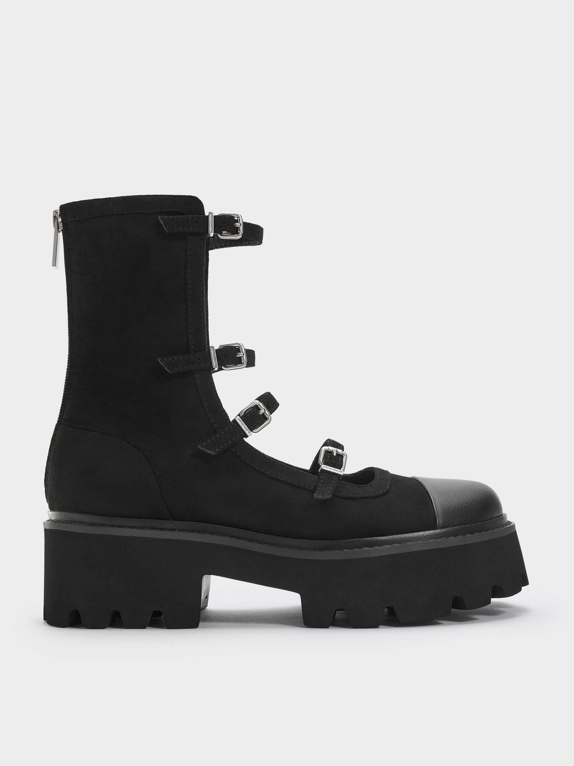 These Celia calf boots in black are made with faux suede and feature four buckled straps, chunky soles and back zips. Match them to oversized outerwear for an edgy off-duty mood.Suede shoes require special care. For cleaning tips, please refer to our detailed guide here.