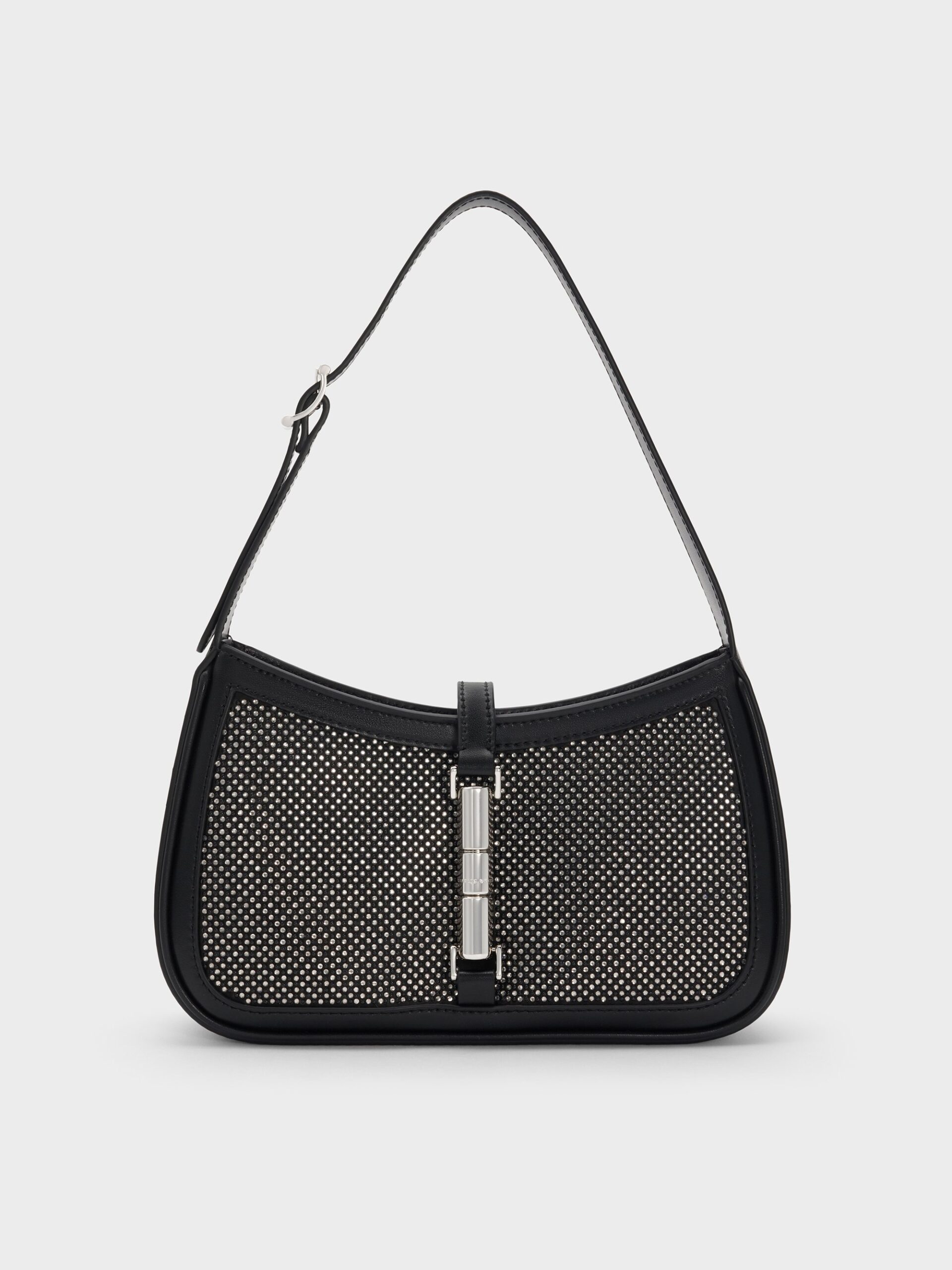 This Cesia shoulder bag in lustrous black is made with satin and features crystal embellishments, a striking metallic buckle, a chic belt detail and a structured profile. Let it bring edge and sharpness to elegant evening ensembles.
