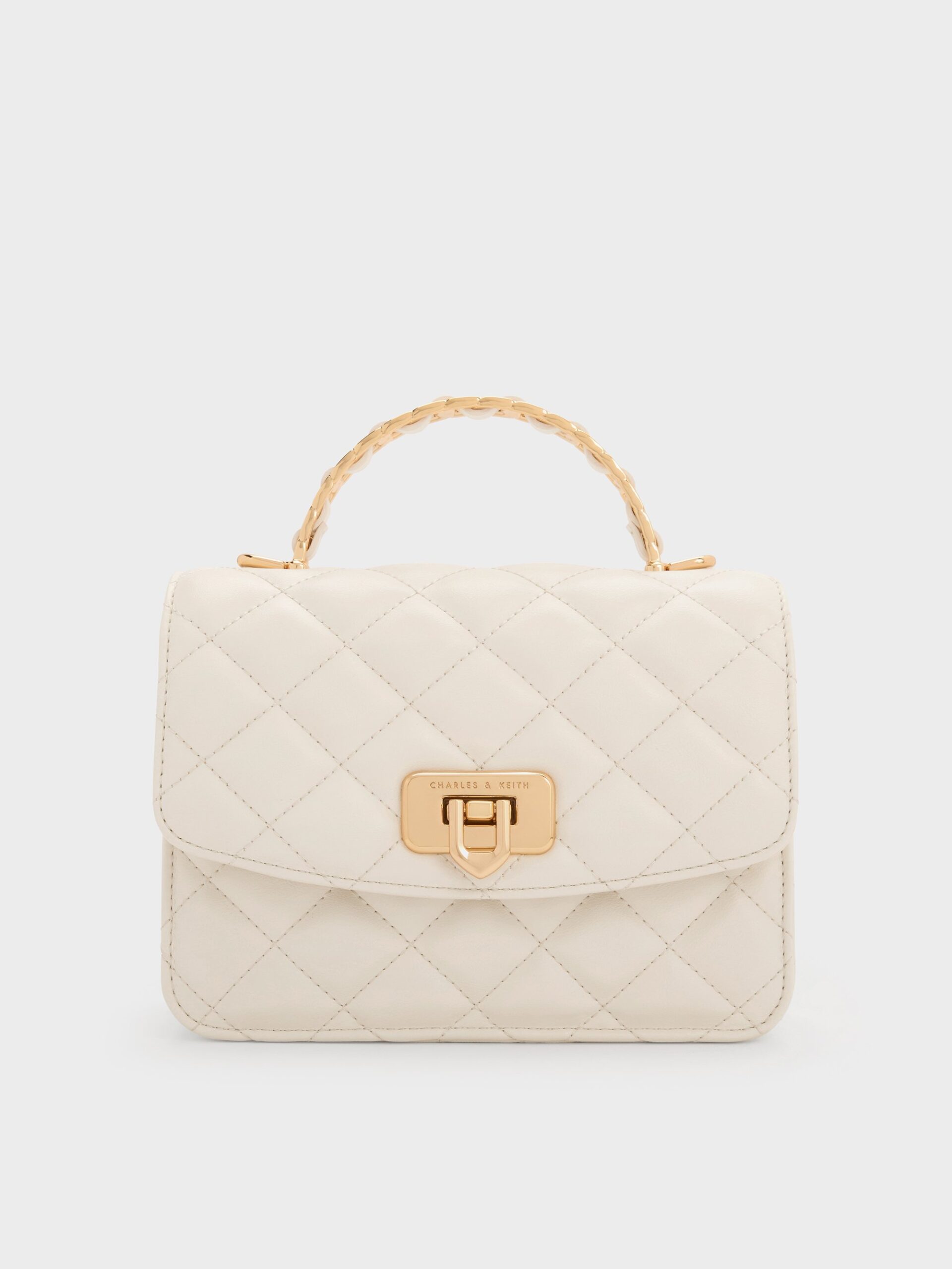 A quilted top handle bag is the epitome of elegance, and this piece is no exception. In a soft, creamy white hue, it lets the beautiful texture and gold-tone accents take centre stage. Its compact yet structured silhouette will comfortably fit your daily essentials, while the detachable braided chain strap offers effortless, hands-free convenience.