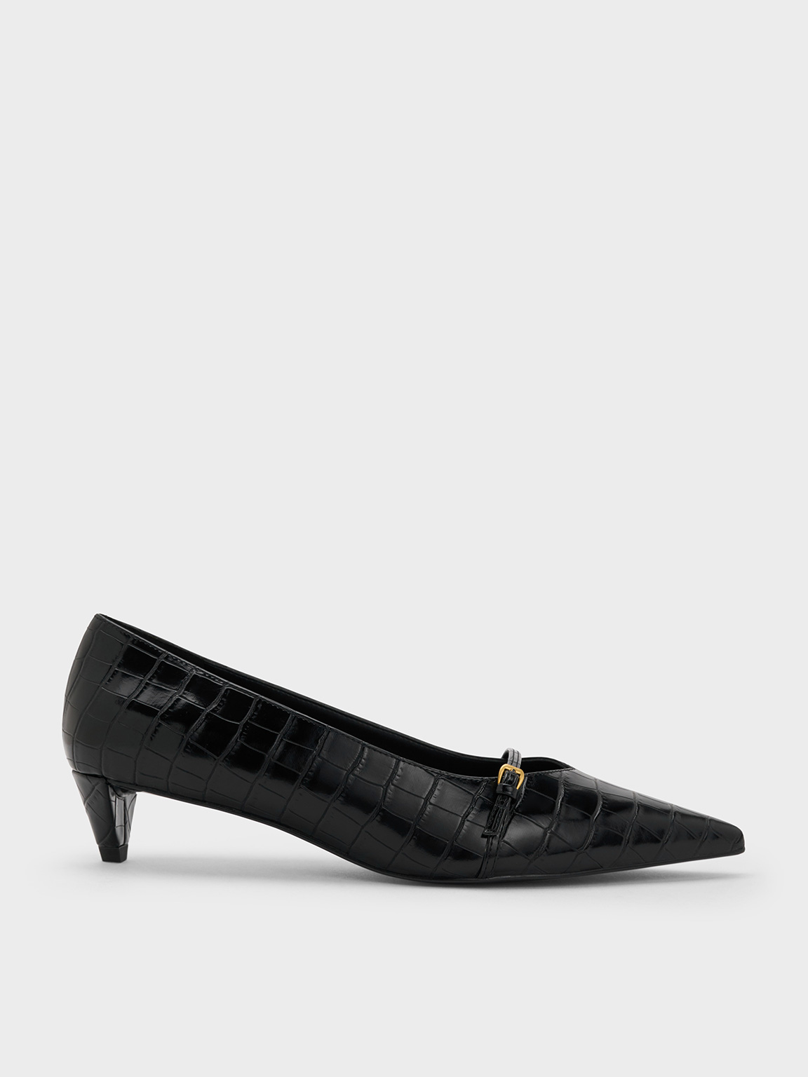 Looking for classic kitten-heel pumps with a decidedly modern twist? This pair is perfect, featuring sharp pointed toes and matching vamps for a sleek look. Adorned with decorative belted straps, they exude edgy elegance. The understated croc-effect finish adds a chic textural dimension, setting them apart from the usual kitten heels. Whether for busy days at the office or an eventful weekend, these pumps will rise to the occasion.