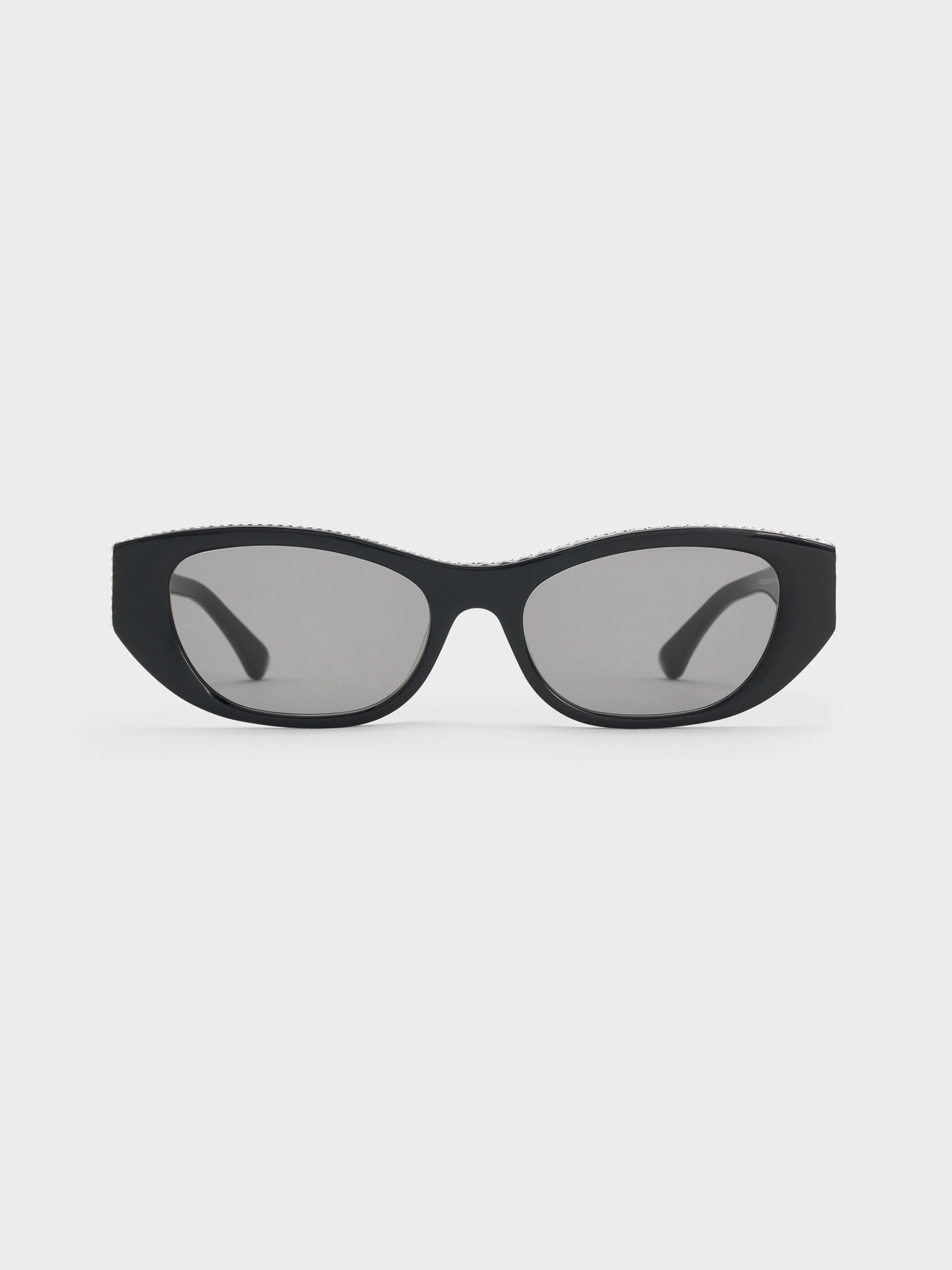 These Daenerys cat-eye sunglasses in black are made with recycled acetate and feature metallic accents, elongated frames, and thick tapered arms. They will instantly elevate your everyday outfits with a touch of suble glamour.