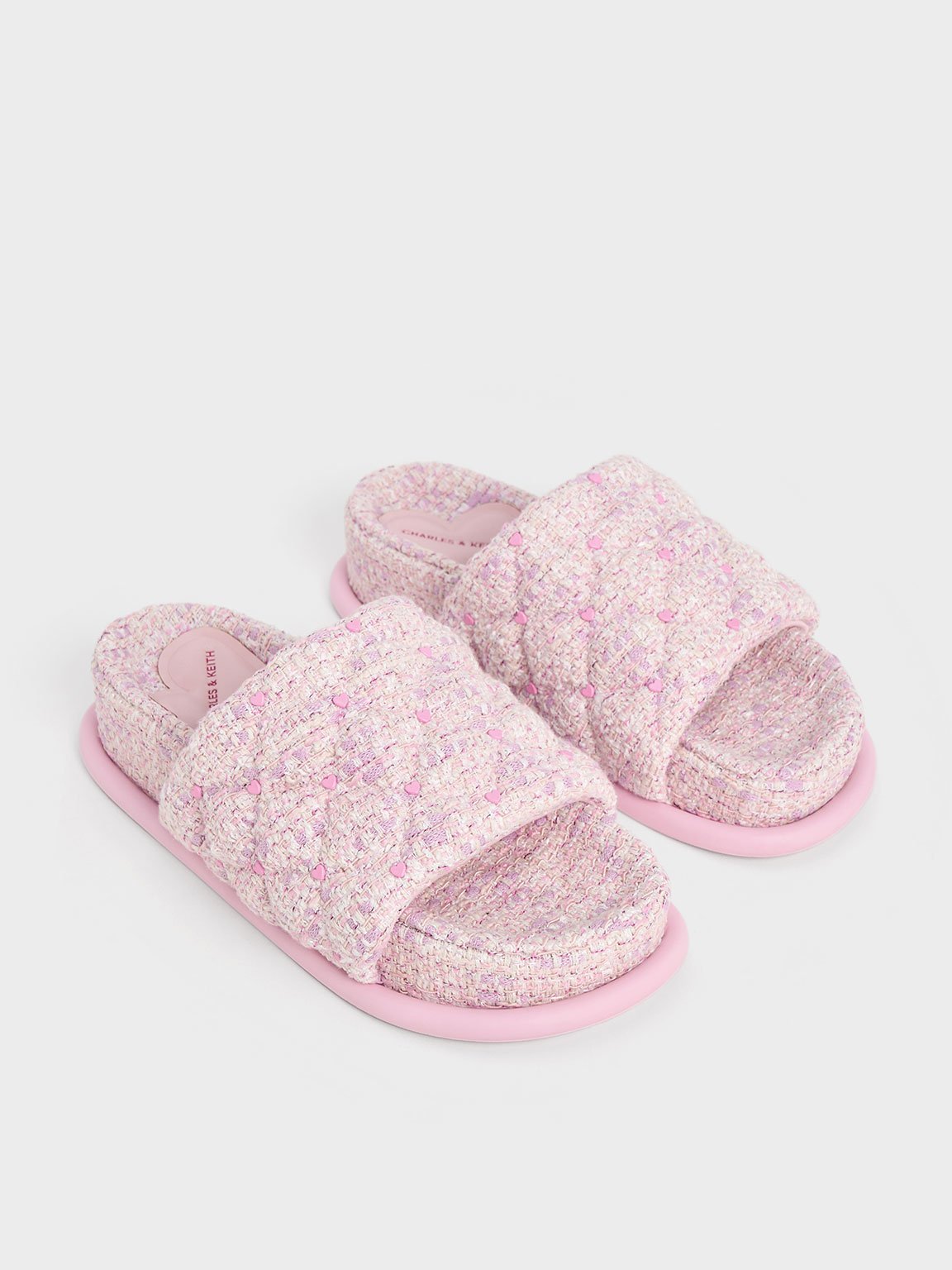 Ideal for the casual-chic girl who adores athleisure style, these Dahlia heart-print sandals are a playful and quirky ode to romance. In sweet light pink with a puffy tweed finish that is studded with matching pink hearts, these chunky shoes make a fashion statement while being comfortable enough to walk in all day. To create a striking monochromatic outfit, wear them with a pink mini dress.