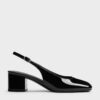 These Danni slingback pumps in black feature a glossy patent finish, rounded square toes, chunky block heels and adjustable slingback straps. Wear them to exude quiet confidence in the office and other professional settings.