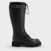 These Darian boots in black feature lace-up fronts, buckle straps, rounded toes and form-fitting shafts. Pair them with flowing skirts to create an edgy utilitarian look that is also undeniably feminine.
